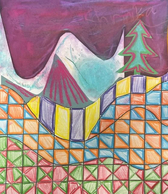 This project challenges students to hold rulers correctly and create X,Y,Z grids while being taught the history of trestle bridge constructions of the industrial revolution. Geometric shapes are then strategically colored to show a unique rhythm through contrast. Once colored, students design a background to express their rollercoaster narrative.